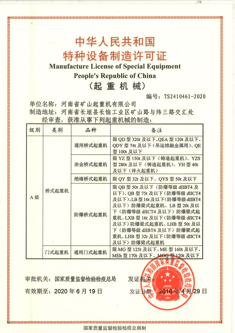 多項(xiàng)科技成果和發(fā)明,在中國(guó)起重行業(yè)處**地位,生產(chǎn)各類國(guó)標(biāo)、非標(biāo)起重產(chǎn)品、起重配套件,從起重機(jī)零部件到整機(jī)批量流水線生產(chǎn),品種全、質(zhì)量?jī)?yōu)、價(jià)格低、交貨及時(shí),服務(wù)周到,整機(jī)設(shè)計(jì)壽命30年,質(zhì)保一年三包服務(wù)