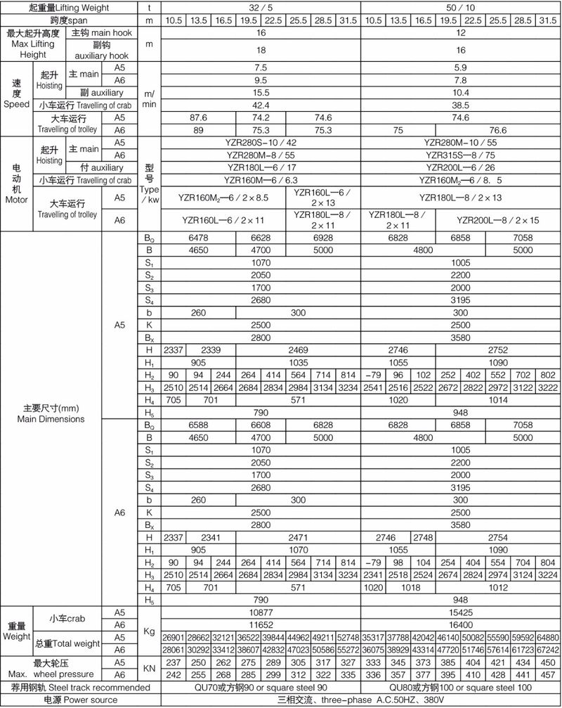 QD型吊鉤橋式起重機,主要由橋架、大車運行機構、小車、電器設備等組成。根據使用頻繁程度不同,分為A5、A6二種工作級別。